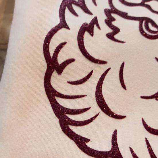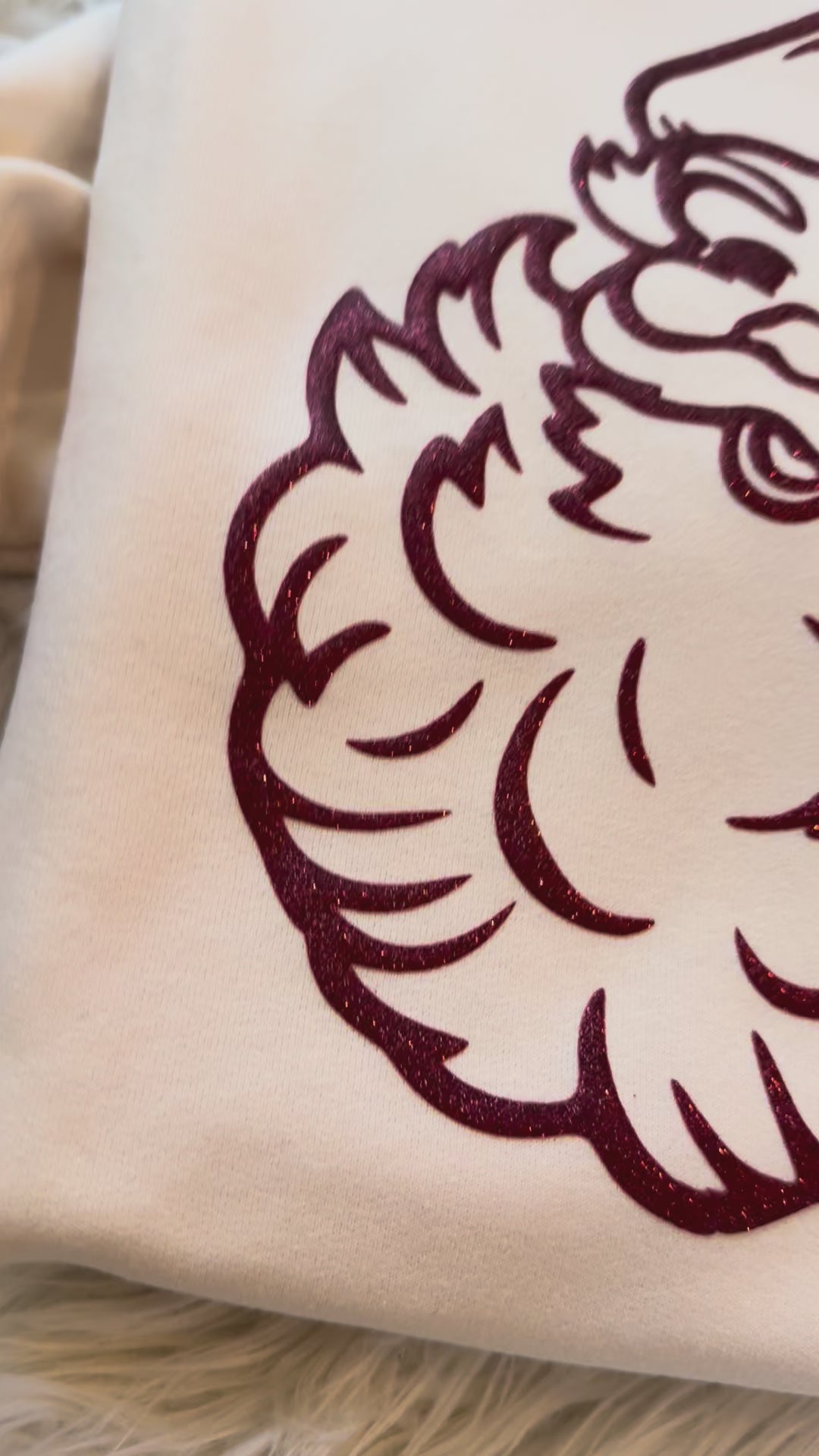 "Get ready to sleigh the holiday season in this Burgundy Glitter puff Santa sweatshirt! Made on a Jerzees brand sweatshirt in sweet cream, it's unisex and features a beautiful glitter puff Santa design. Perfect for adding some festive flair to your wardrobe. Don't miss out on this jolly trend!"