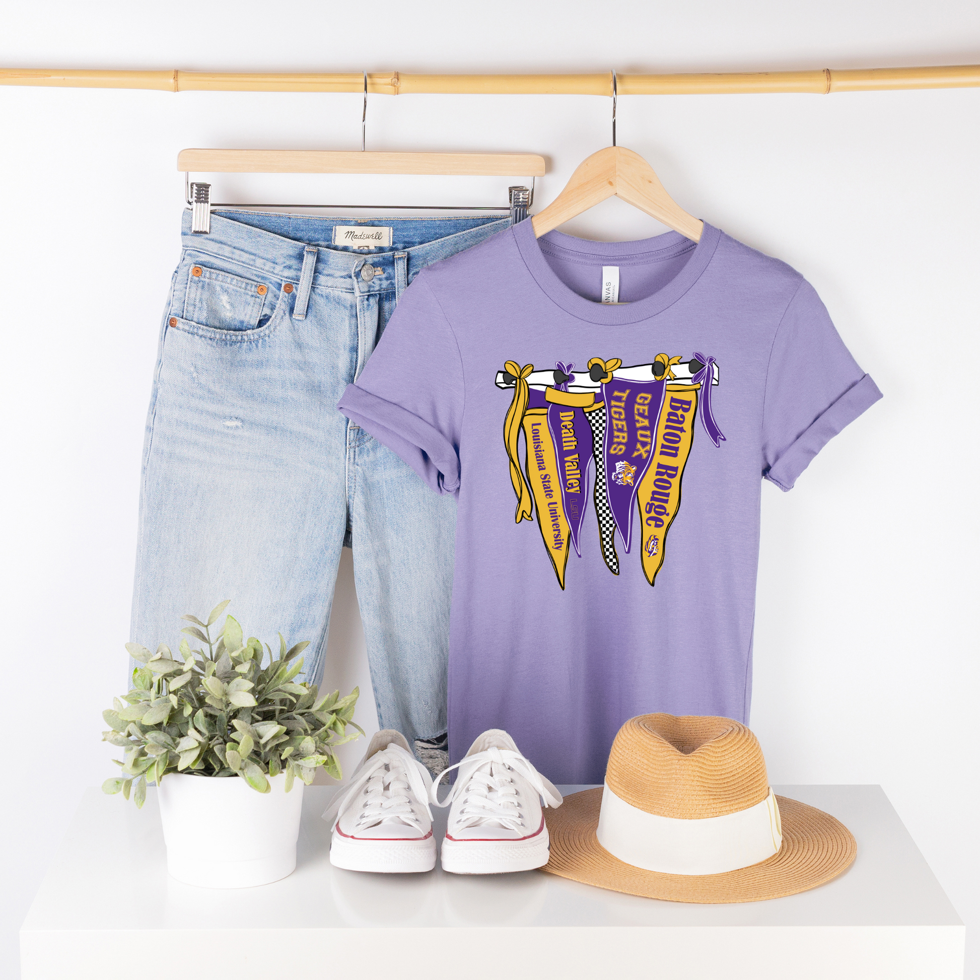 Show your team spirit in style with the Cute Pennant Flags Tee! Available in cozy Comfort Colors or the soft, high-quality Bella Canvas brand, this tee is perfect for game day or any day you want to cheer on the Tigers. Its playful design and comfy fit make it a go-to favorite for fans who love to combine comfort with fun. Get ready to roar with pride and stay comfy all season long!