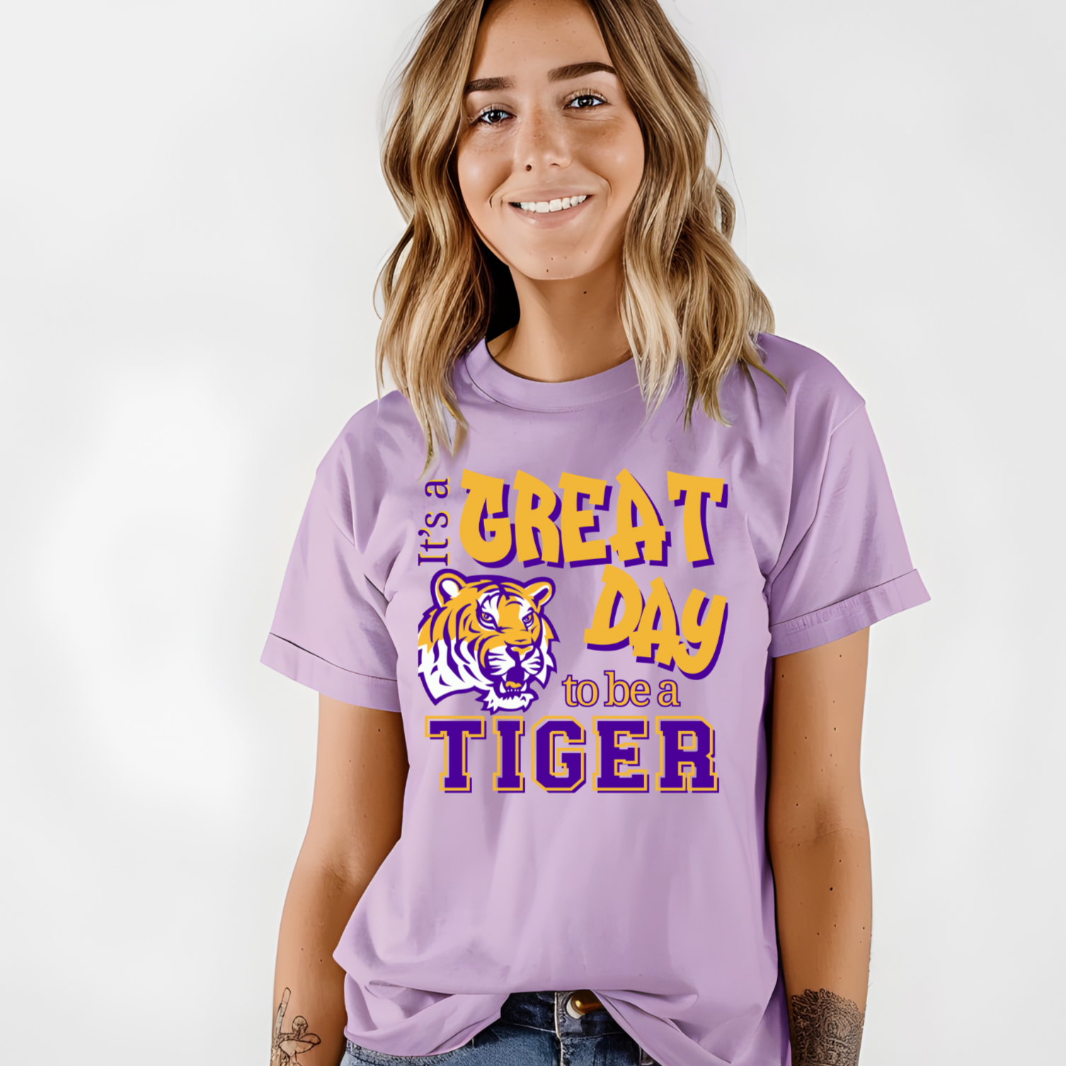 This "It's a Great Day to Be a Tiger" tee features a soft, comfortable fit thanks to its Comfort Colors unisex fabric. Choose from three vibrant shirt colors to show off your tiger pride in style. Prefer a different brand like Gildan or Bella Canvas? Just reach out via Facebook Messenger or email, and we’ll happily customize your order with a special invoice. Perfect for anyone ready to roar with enthusiasm every day!