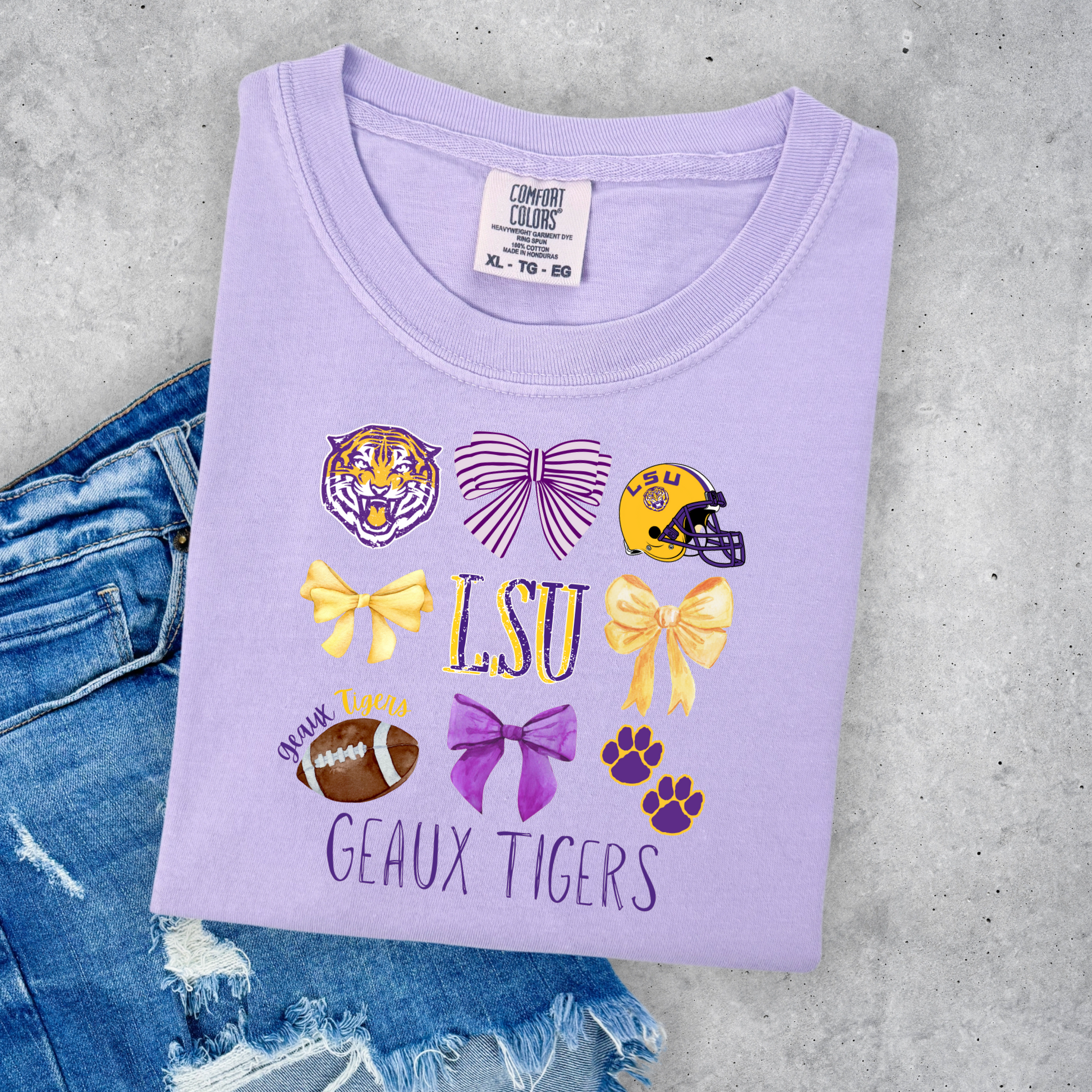DISTRESSED GEAUX TIGERS COQUETTE BOW TEES