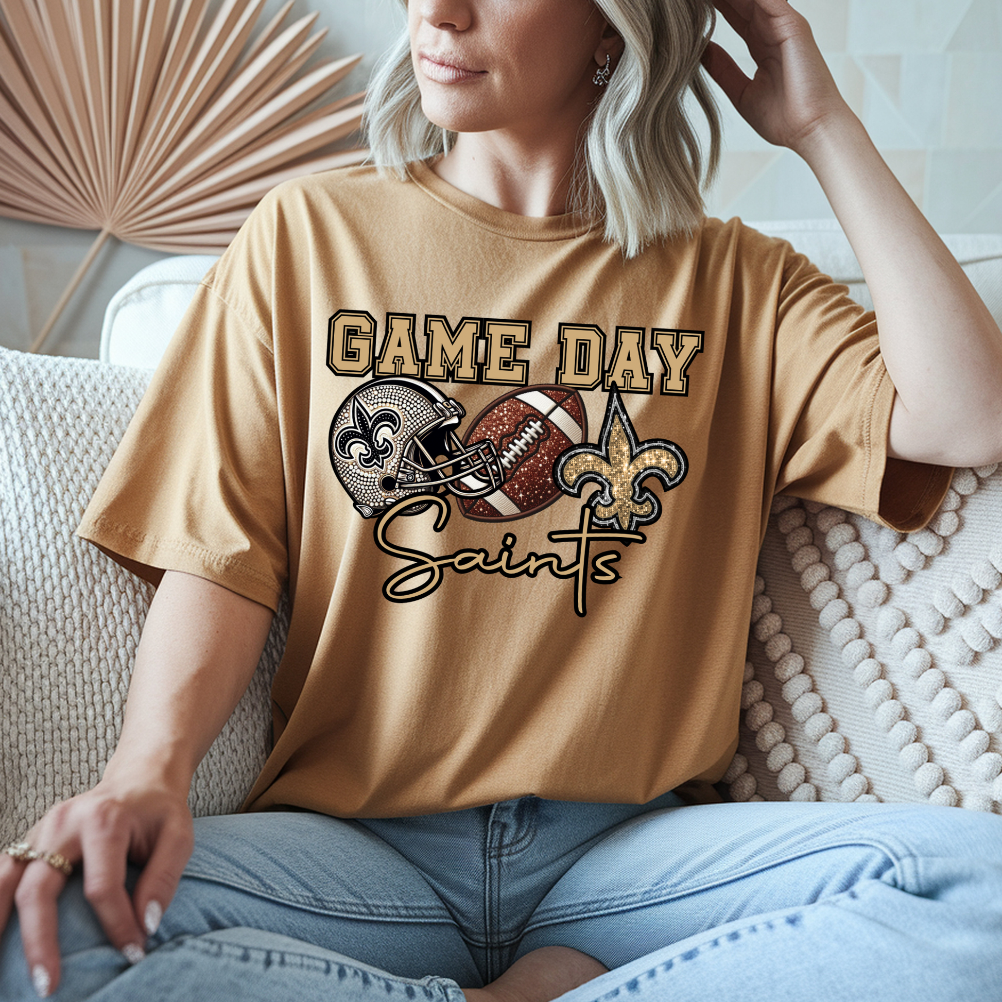Get ready to cheer in style with this playful Saints game day tee featuring a dazzling faux glitter and rhinestone print—all without the actual sparkle! This comfy unisex shirt uses vibrant DTF printing to bring the glam and spirit without any glitter mess. Perfect for game day fun and everyday wear!