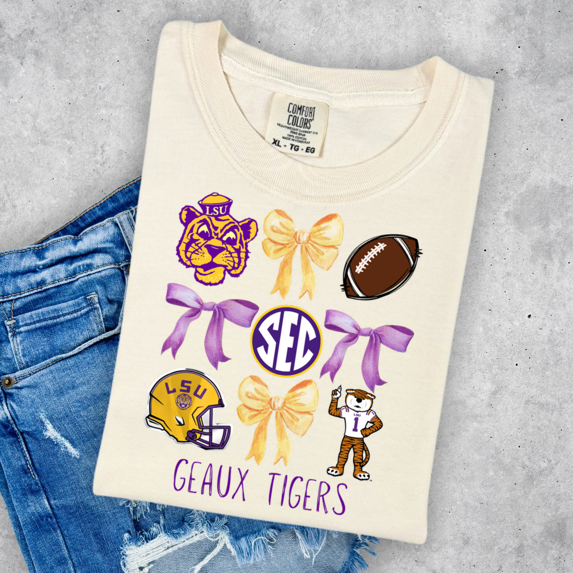 Show your team spirit with the Geaux Tigers Coquette Bow Tee, a playful and comfy unisex shirt perfect for game day or casual wear. Its vibrant colors and charming bow detail add a fun twist to your fan gear, making it easy to cheer on your Tigers in style and comfort.