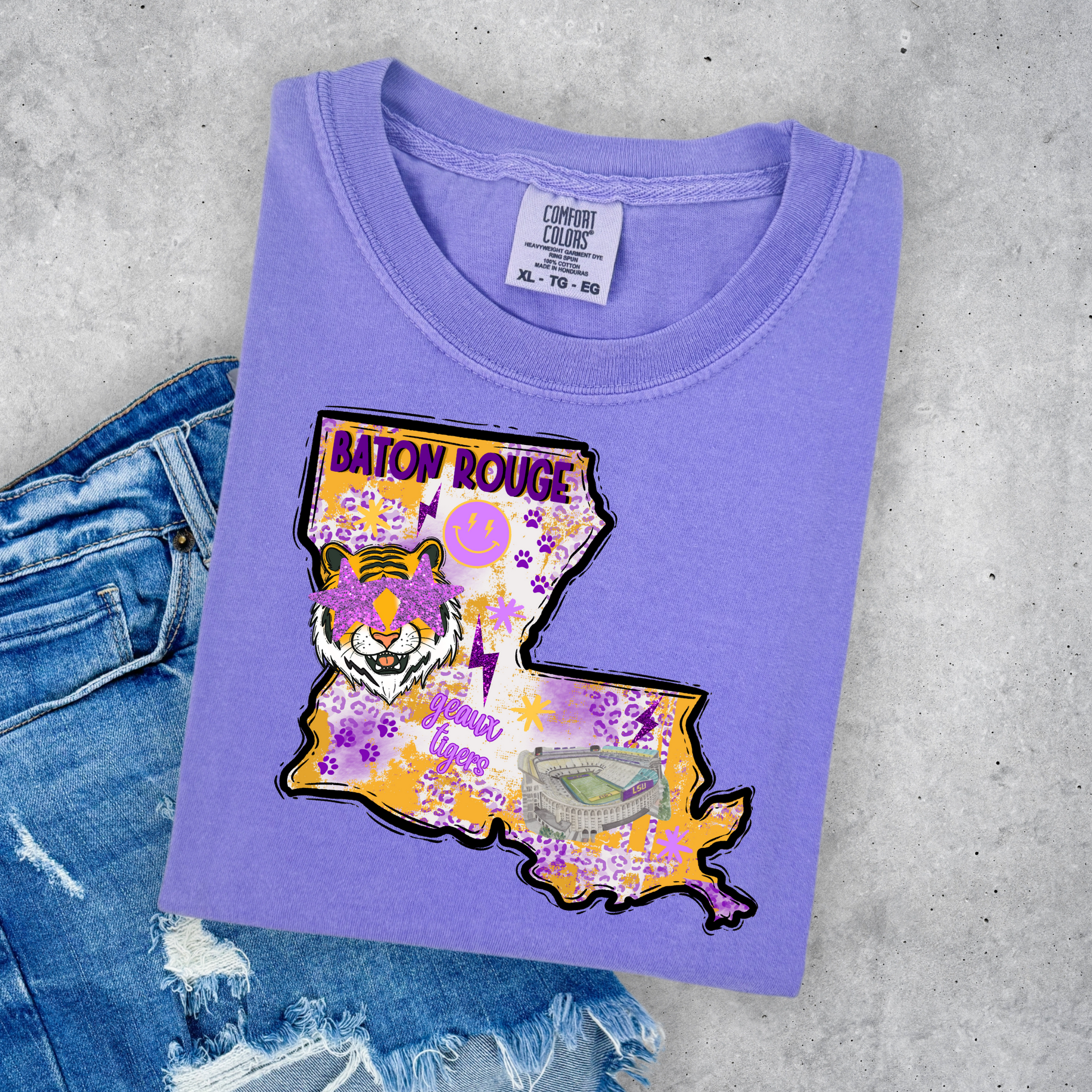 Show your school pride with the LA State Spirit Tee, crafted on a cozy unisex Comfort Colors shirt. Perfect for game day, this soft and durable tee lets you cheer on the Tigers in style and comfort, whether you’re in the stands or out with friends. Get ready to roar and make every touchdown a little more spirited!