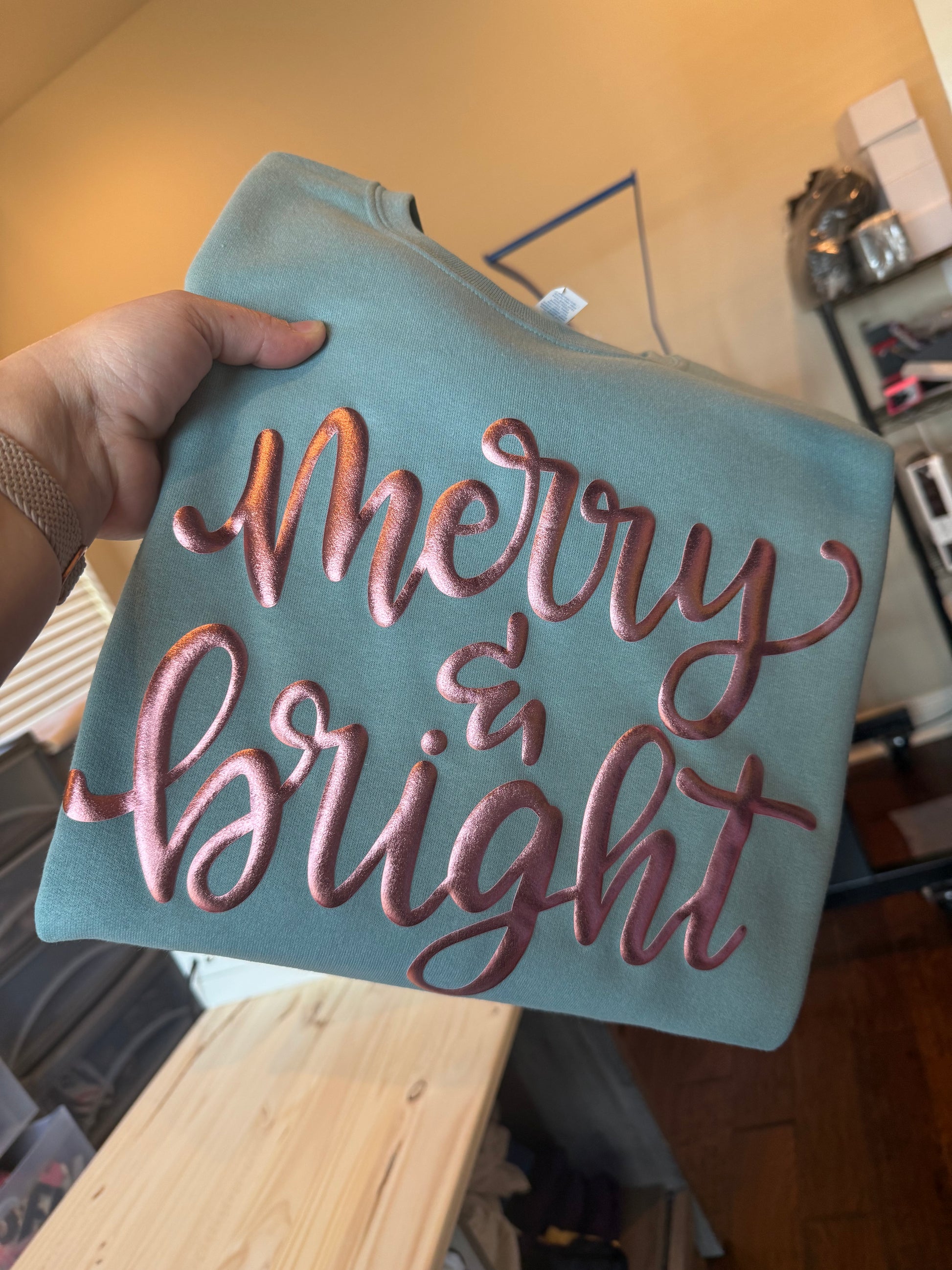 ROSE GOLD PUFF MERRY & BRIGHT SWEATSHIRT